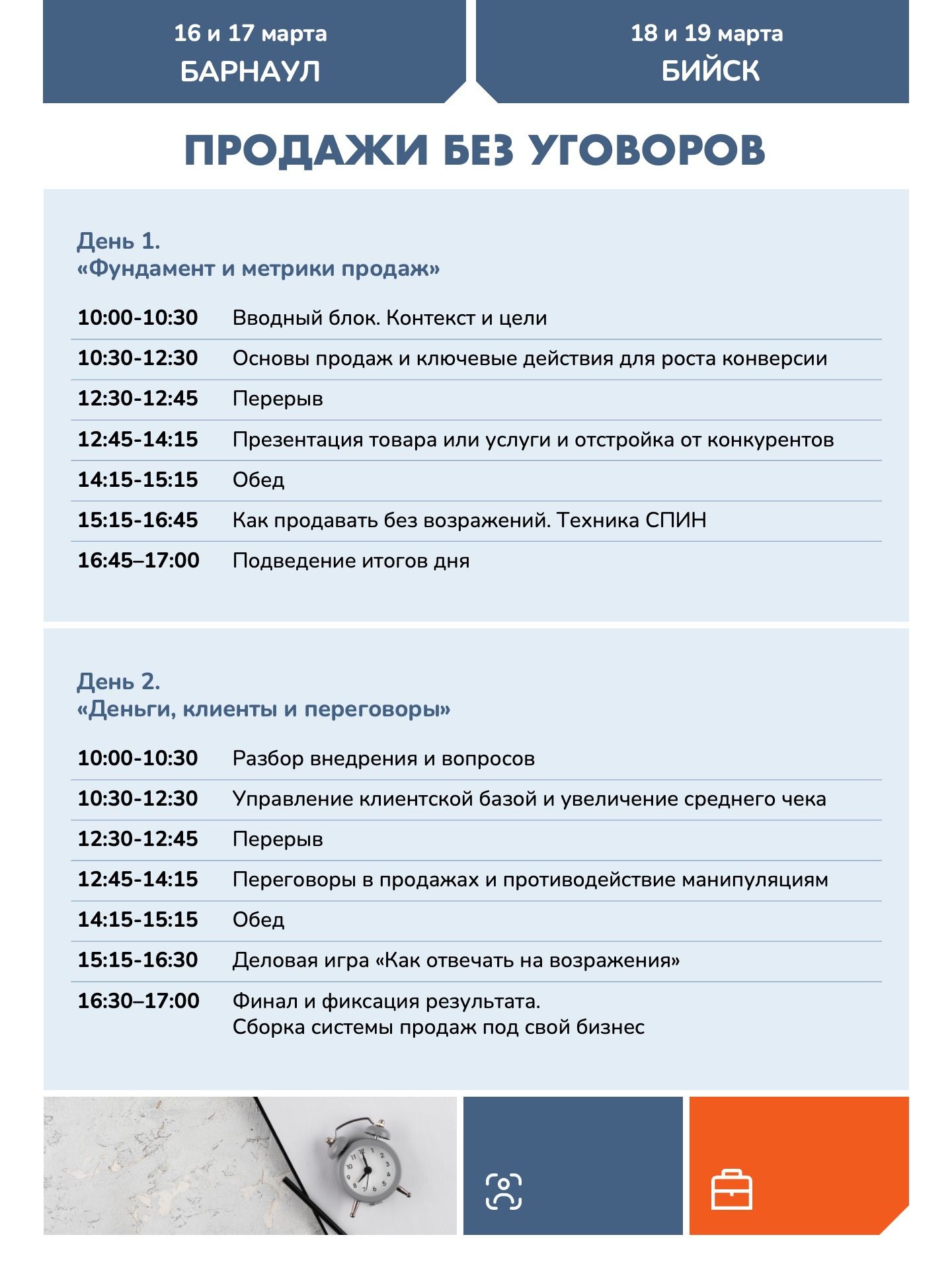 Хотите научиться продавать без давления и выстроить уверенную позицию в переговорах? Центр «Мой бизнес» приглашает принять участие в 2-х-дневной образовательной программе, направленной на развитие системных и экологичных продаж «Продажи без уговоров», которая пройдет в г. Барнауле (16-17 марта) и г. Бийске (18-19 марта).